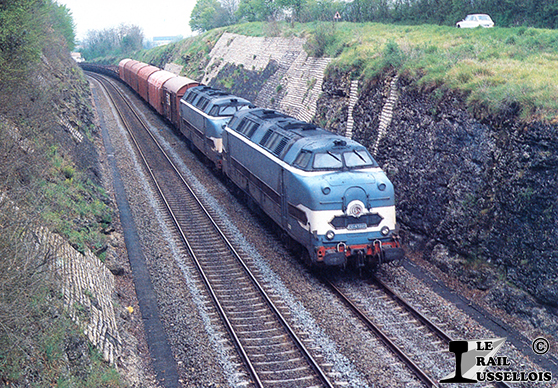 Tracté par les CC 65001 et CC 65005, un train de marchandises Nantes – Hourcade passe près de Bussac (17).