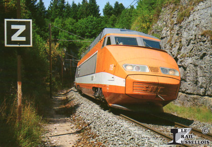 Le TGV-PSE rame 118 « Cisalpin », Paris-Lyon – Lausanne, traversant la forêt de La Joux, sort du tunnel de Montrainçon (39).