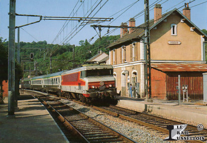 Tracté par la CC 6520, un train Toulouse-Matabiau – Paris-Austerlitz traverse à pleine vitesse la gare de Vigeois (19).