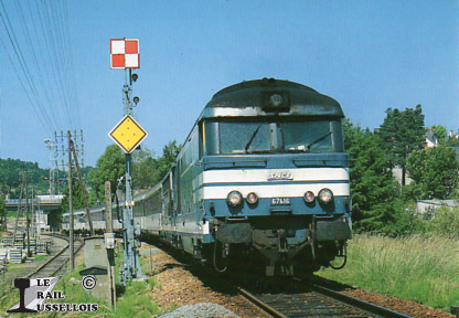 Tracté par les BB 67616 et BB 67453 en UM, le « Ventadour » Bordeaux-St-Jean – Lyon-Perrache quitte Ussel (19).