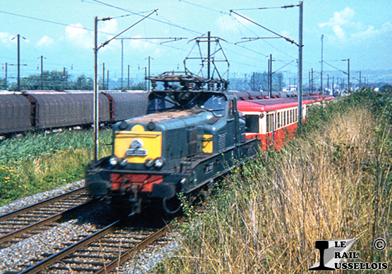 En charge d’un omnibus Charleville-Mézières – Sedan, une BB 12000 tractant trois XR unifiées longe Lumes-Triage (08).