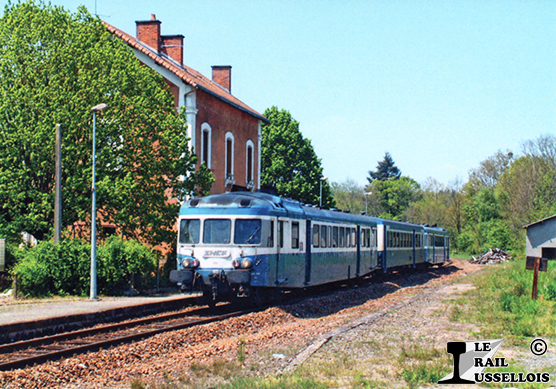 Composé de deux autorails X 2800 encadrant une XR 6000, le train Poitiers – Limoges-Bénédictins dessert la gare de Nieul (87).