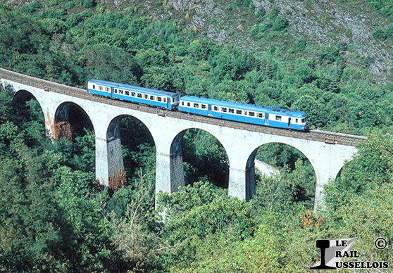 Un autorail X 2800 et son XR 6000, Langogne – Nîmes, franchissent le viaduc de la Malautière (30) (48).
