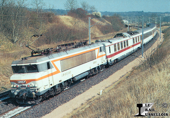 Suite à l’électrification de la ligne Paris – Clermont-Ferrand, le train d’essai tracté par la BB 22332 passe près de Randan (63) et fonce vers la capitale Auvergnate.