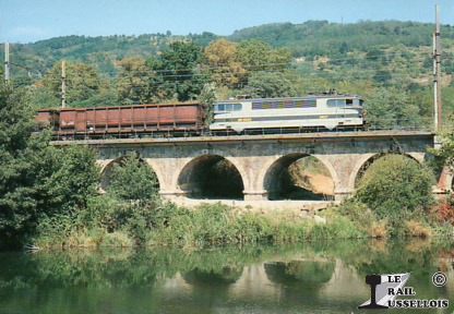 Un train de marchandises tracté par la BB 9509 franchit la Galaure à St-Vallier (26).