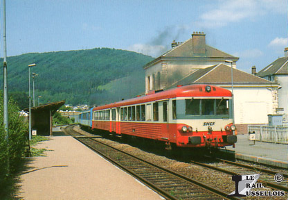 Les autorails « EAD » X 4397 et X 4396 modernisé « Champagne-Ardennes », Givet – Charleville-Mézières, quitte la gare de Nouzonville (08).